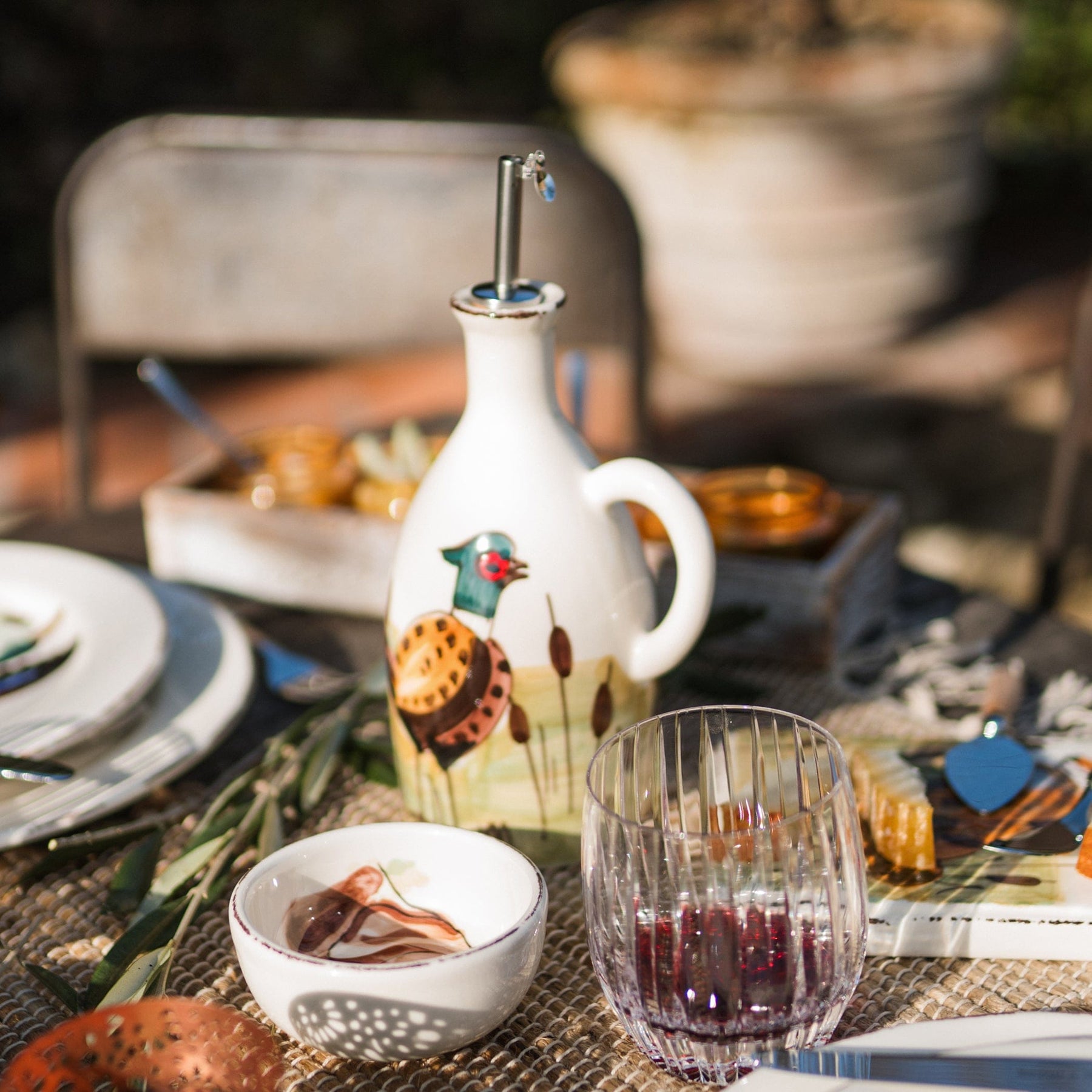 The Wildlife Pheasant Handled Olive Oil Bottle brings the beauty of the outdoors to your kitchen with its handpainted pheasant design. Crafted by Italian artisans, this functional piece is perfect for storing and serving olive oil, adding rustic elegance and a touch of wildlife whimsy to your countertop.