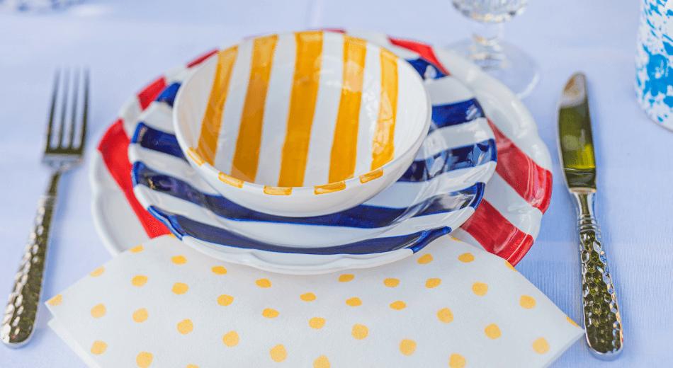 The Amalfi Coast’s joyous explosion of color is celebrated in the brilliant blues, sunwashed reds, and saturated yellows of Amalfitana. Color is king in this part of paradise, and this collection livens up any table with vibrant, cheerful style. Crisp stripes and traditional Italian splatter designs are meant to be mixed and matched to create unique and lively looks.