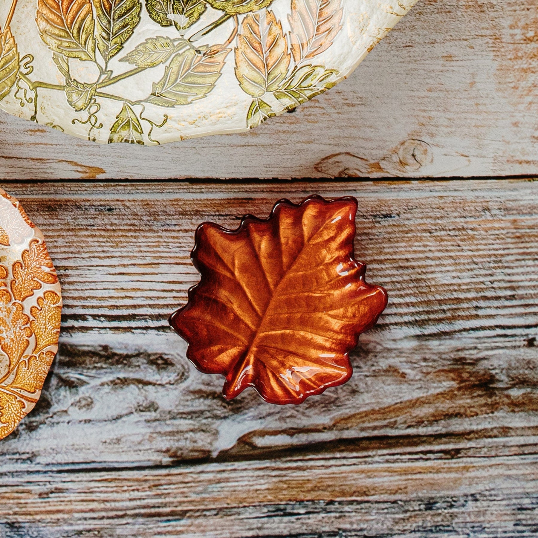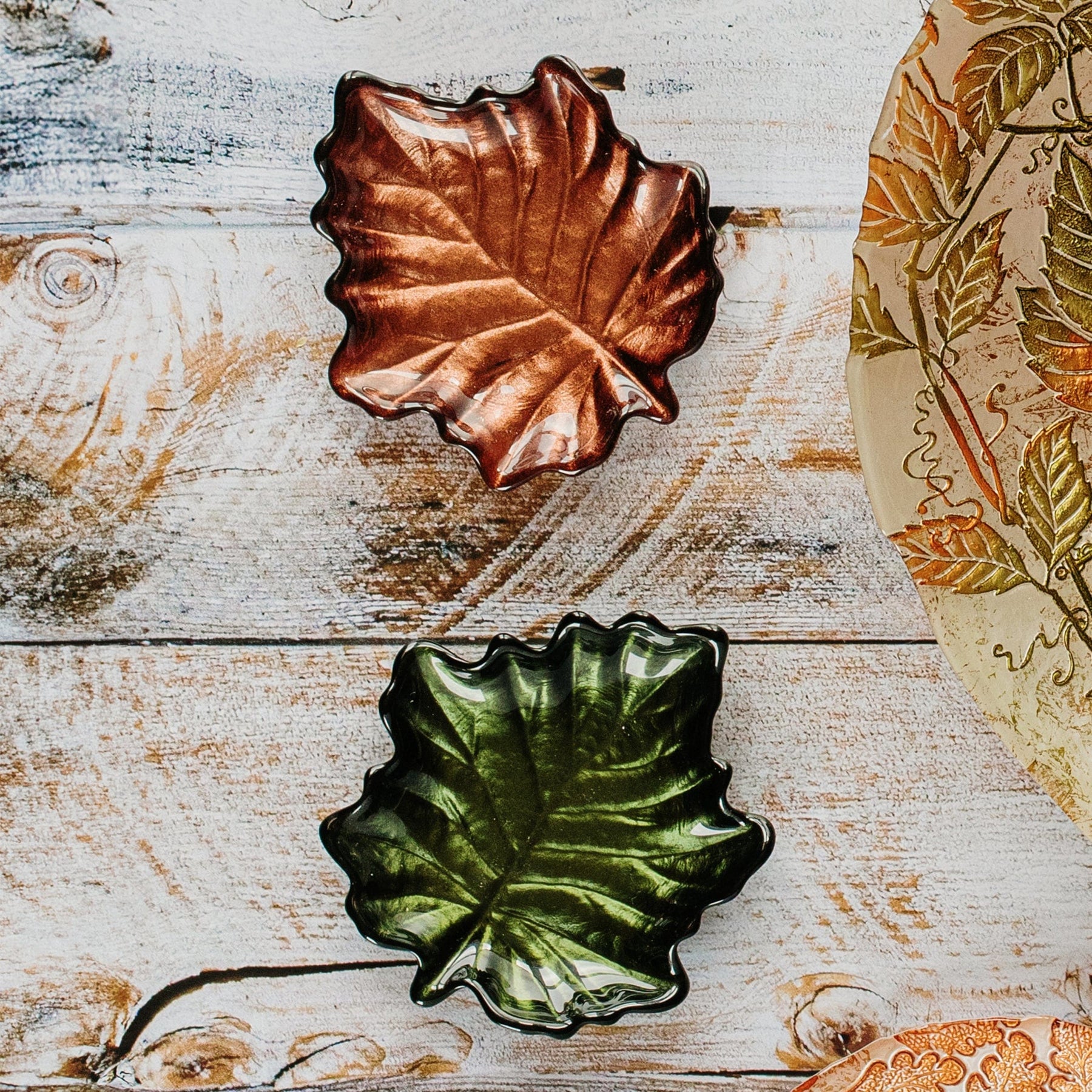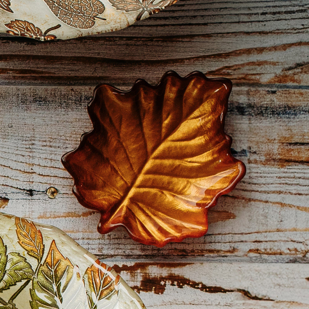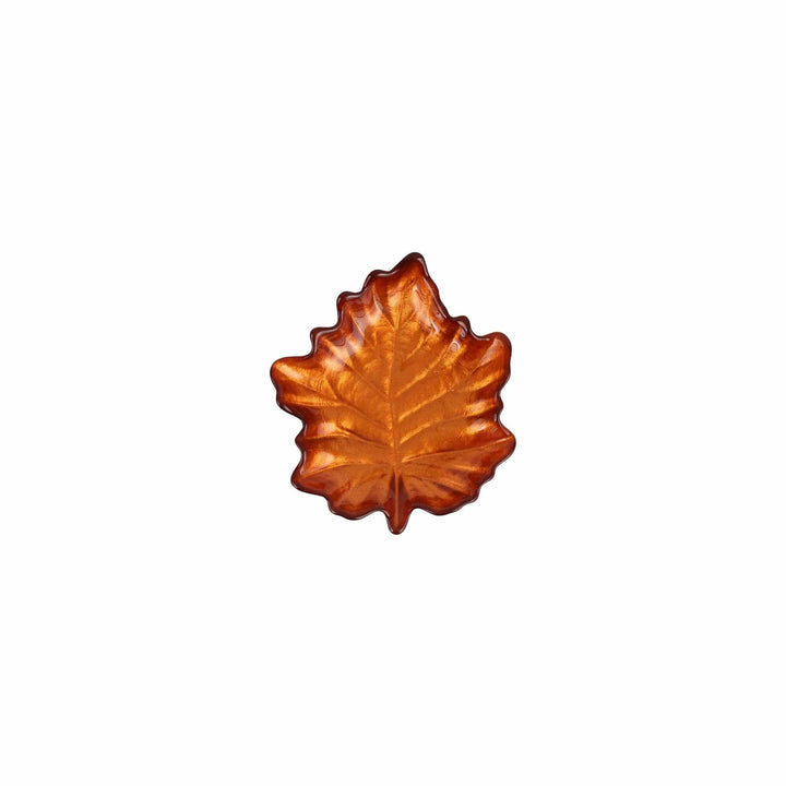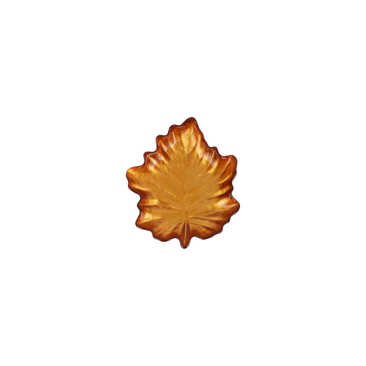 Glimmering and warm, the Autunno Glass Figural Leaf Canape Plates capture the magic of afternoon light filtering through richly colored autumn leaves.