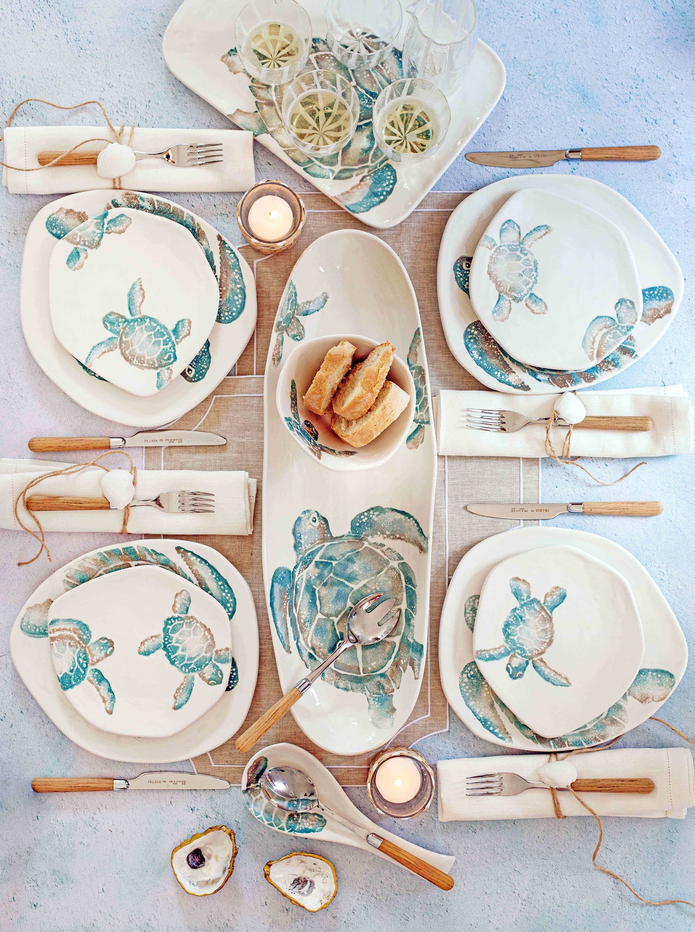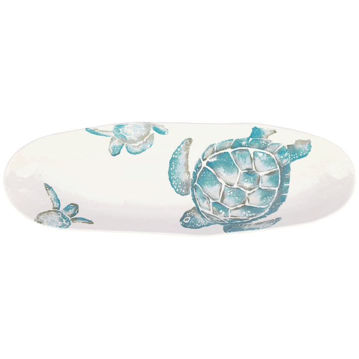 Handpainted sea turtles in hues of aqua and taupe glide across a clean, white canvas on the Tartaruga Long Oval Platter. Maestro artisan, Gianluca Fabbro, utilizes a unique sponging technique to carefully add detail to each piece.