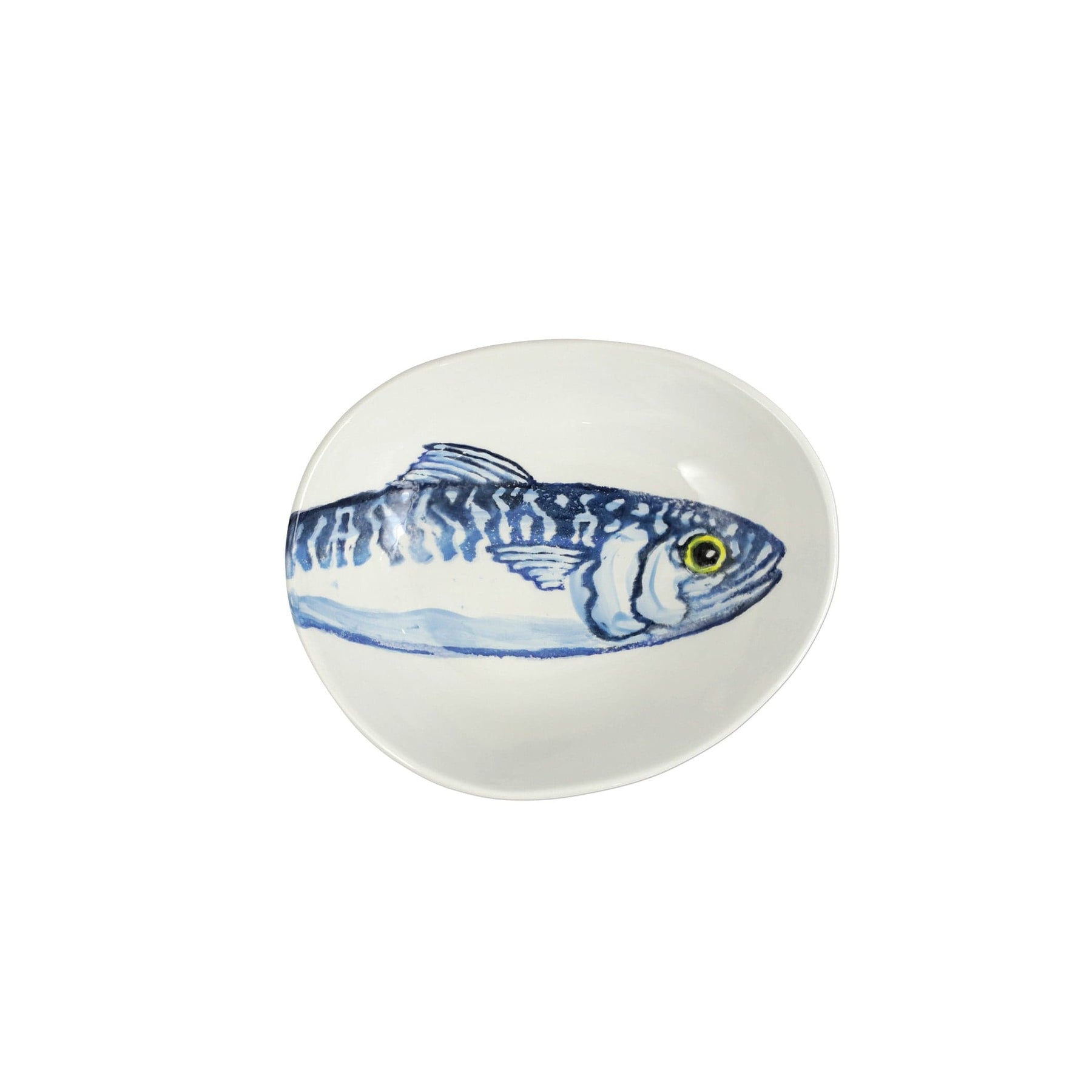 The Maccarello Oval Pasta Bowl illustrates a school of blue mackerel, commonly found along the Mediterranean and Adriatic Sea, handpainted by maestro artisan, Gianluca Fabbro, using his unique sponging technique.