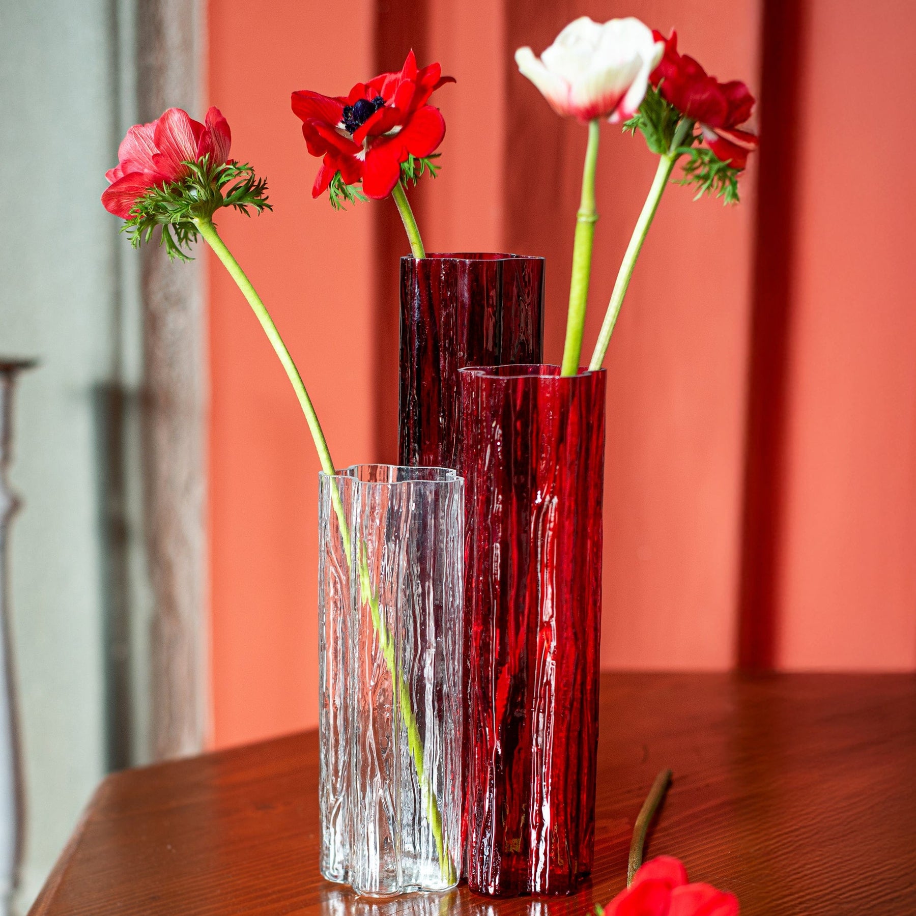 Mouthblown and striking, the Flora Glass Red Vase is a trio of vases designed for a small arrangement. The like colors create a sophisticated ombre effect in your home.