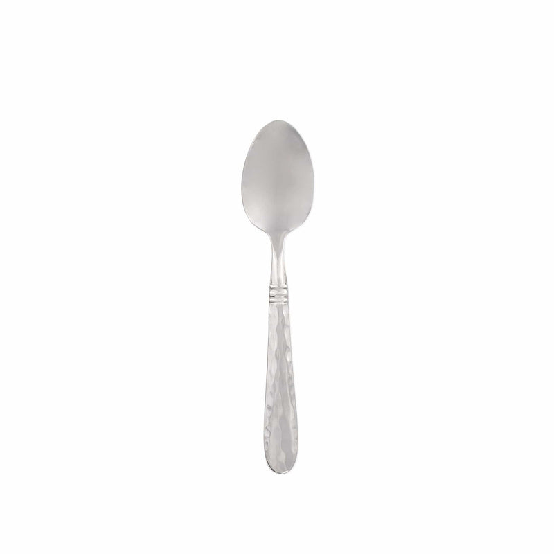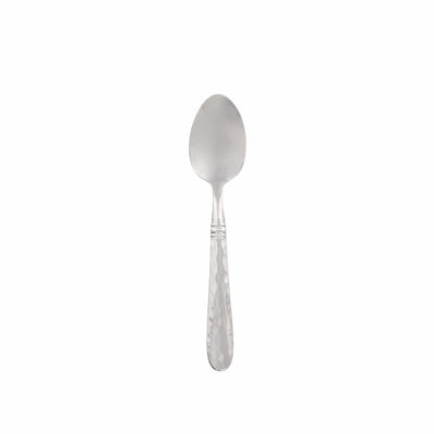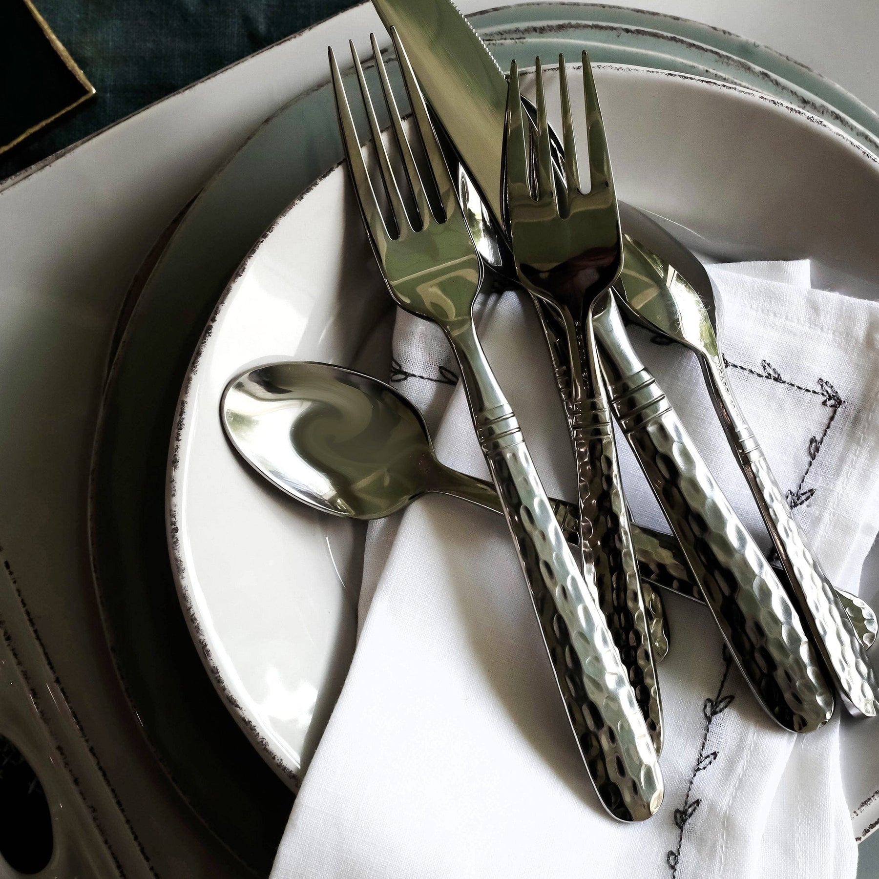 Italian artisans forge the Martellato Place Spoon thus adding hammered detail. The 18/10 stainless steel combined with years of craftsmanship result in a well-balanced, weighty flatware. This hammered flatware set is made in Lumezzane, Italy, by the Bugatti family.