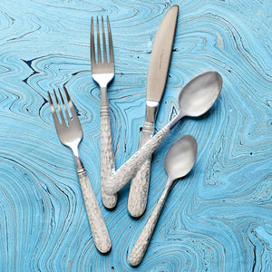 Italian artisans forge the Martellato Teaspoon thus adding hammered detail. The 18/10 stainless steel combined with years of craftsmanship result in a well-balanced, weighty flatware. This hammered flatware set is made in Lumezzane, Italy, by the Bugatti family.