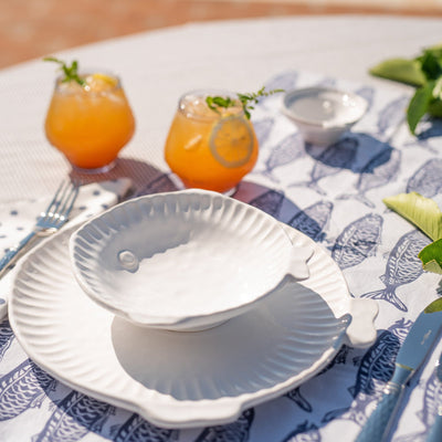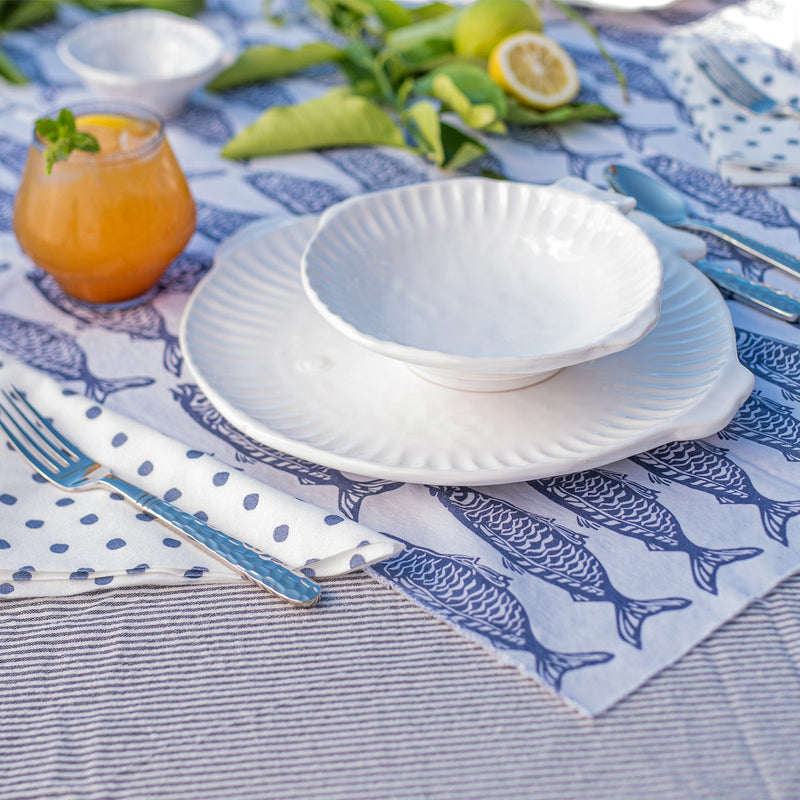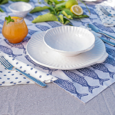 Playing off the handpressed edges of Pietra Serena, the Pesca Serena Dinner Plate has charming fish details to create a playful yet sophisticated coastal table.