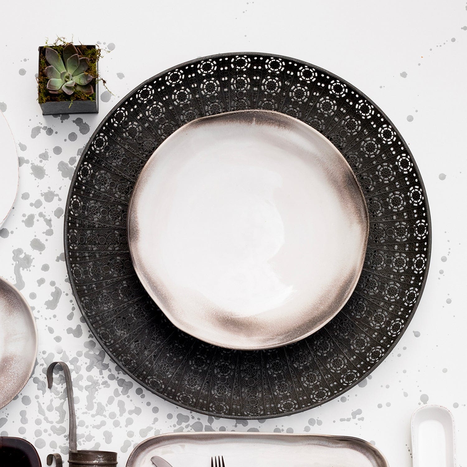 Italian ceramist, Francesco Venzo, meticulously molds the Aurora Ash Shallow Bowl by hand before applying a charcoal, reactive glaze to complete the look. Handcrafted of durable stoneware in Veneto, Aurora is the result of a beautiful collaboration is maestro artisans and skilled craftsmen.