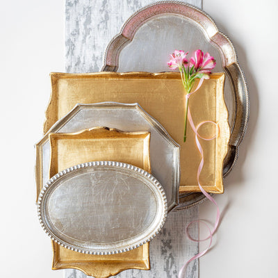 Maestro artisans handcarve each beautiful curve of the Florentine Wooden Accessories Large Oval Tray before applying a signature gold or platinum leaf. This timeless collection is handcrafted in Florence, Italy, home to the Renassiance and the influential Medici family.