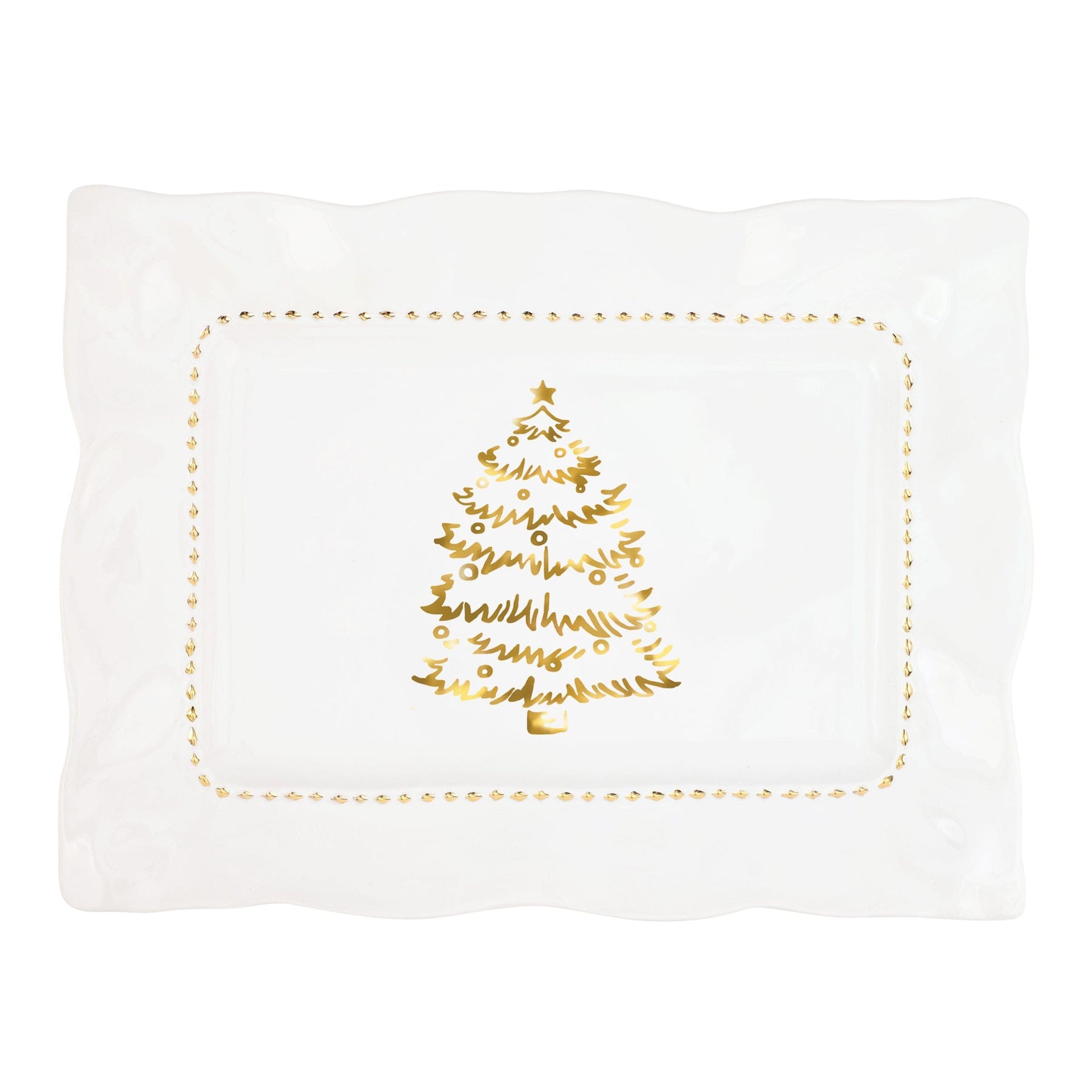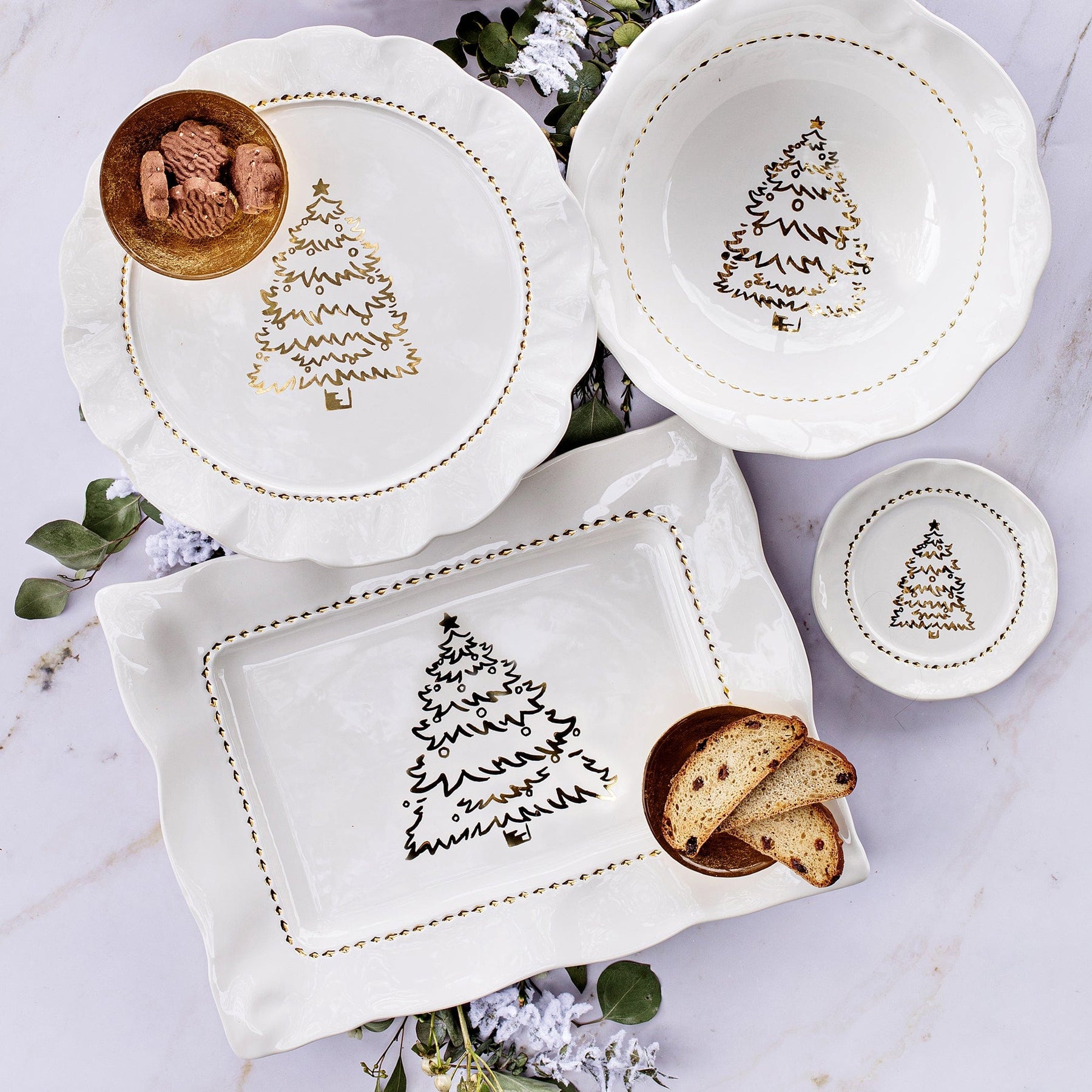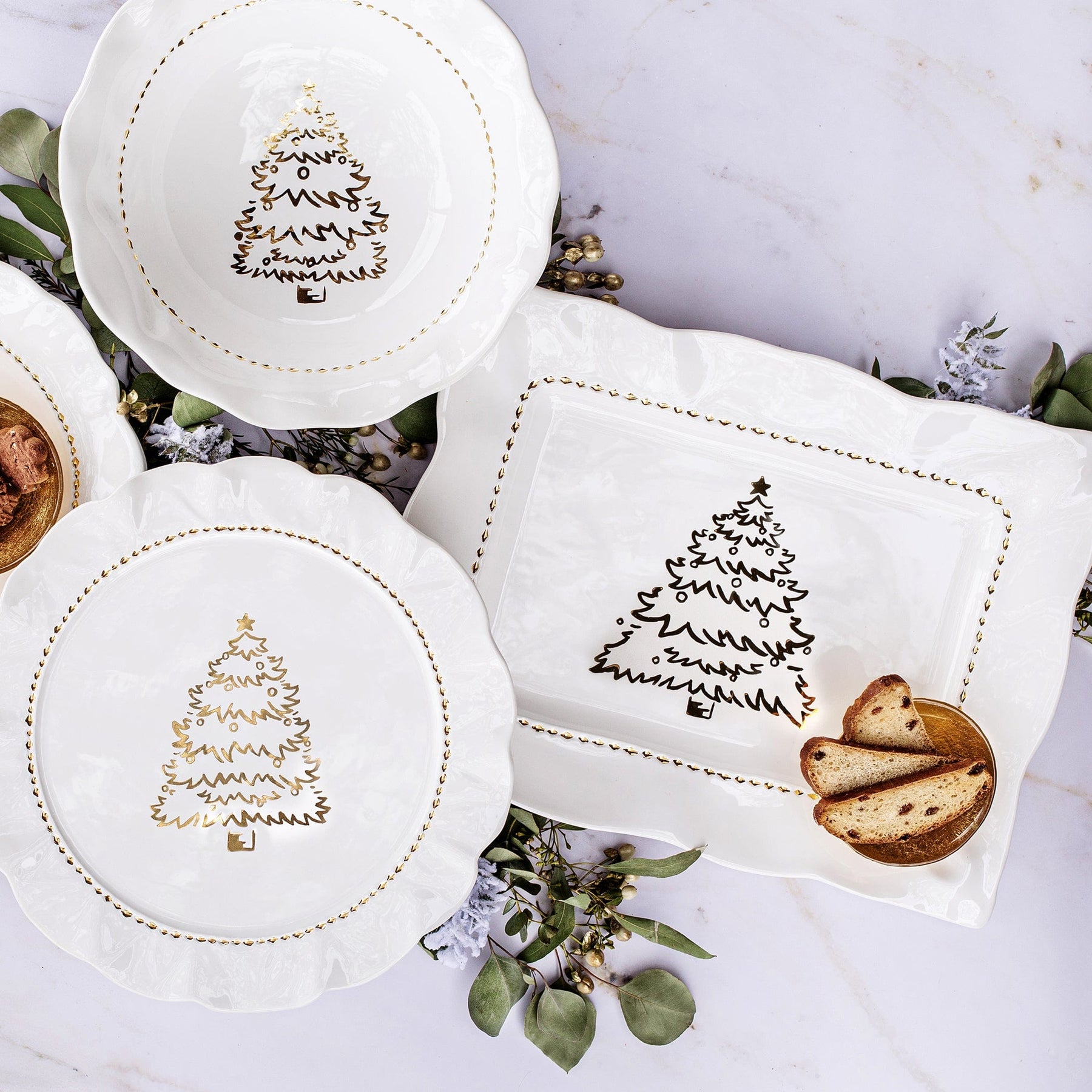 Giorno di Festa translates to a "day of happy events", and this sophisticated, joyful dinnerware ensures just that. A simple gold tree and wreath adorn the Giorno di Festa Rectangular Platter and the result is timeless. You will enjoy this collection every holiday season for decades to come.