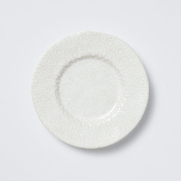 A soft white pigment modernizes a timeless lace texture on the Lace White Salad Plate. Laid-back and lovely, this collection is reminiscent of the fabric of your wedding dress, your grandmother