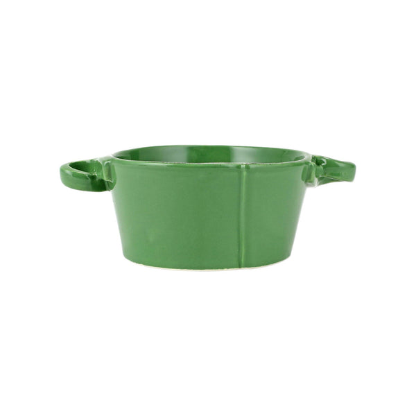 Beloved for its sophisticated simplicity, versatility, and durability, Lastra is our bestselling collection. The understated elegance, clean lines, and unique shape of the Lastra Small Handled Bowl make it a timeless piece for your kitchen and table. With sturdy handles, this piece is an excellent choice for serving warm soups or stews. Lastra’s design was inspired by the circular wooden slabs used for centuries to create the outer mold in cheesemaking throughout Italy. When fashioned together with twine, the hoop was left with a slight overlap to help maintain the shape of the cheese mold. Maestro molder Stefano Roselli incorporates the overlapping detail into the entire design, from its foot to its rim. A dark dusting on the edges of each piece suggests the ash that was used to preserve these cheeses and highlights each unique silhouette.