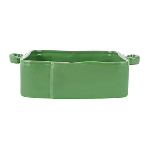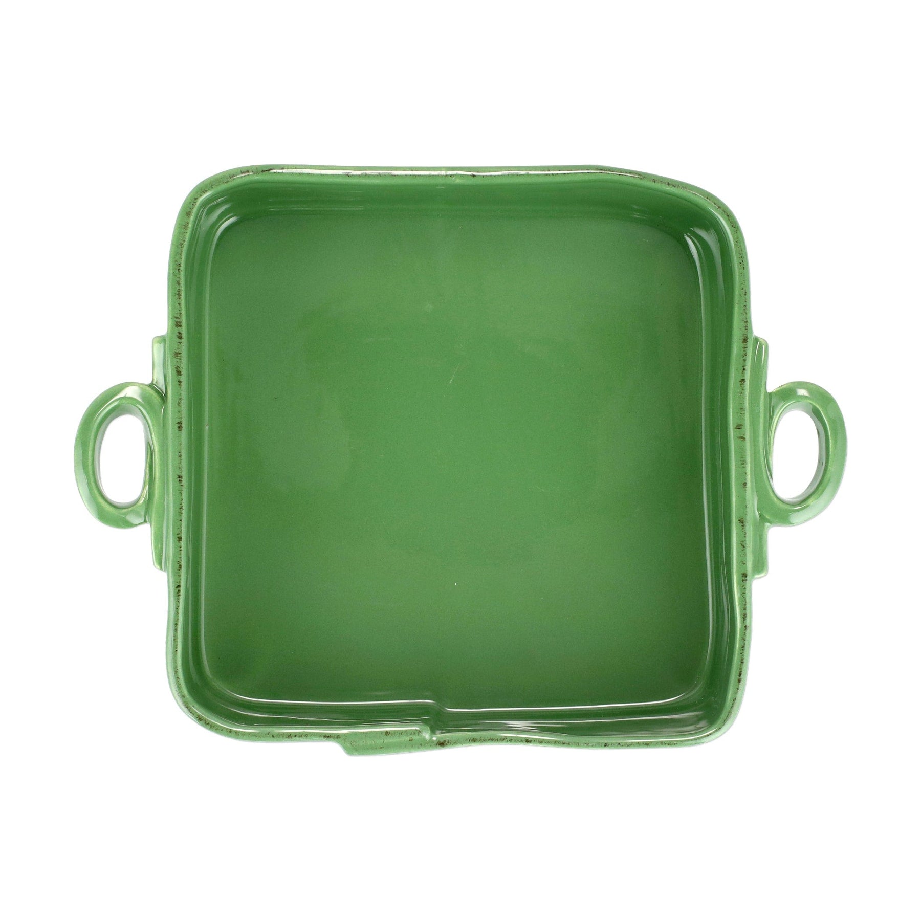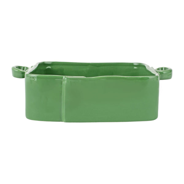 Oven Safe - VIETRI's casserole and baking dishes can be used in most conventional ovens and dishwashers. They are handcrafted of very dense clays and fired at high temperatures, making them heat resistant up to 400°F. Do not use casserole lids in the oven, unless otherwise noted. Hot casseroles and baking dishes should never be placed on cool, damp, or unprotected surfaces. VIETRI bakeware should never be taken directly from the refrigerator to the oven due to the extreme temperature change, nor should it be placed directly from oven to freezer. The handles of these pieces are decorative and should not be used for support. Please remove the bakeware from the oven by holding the body of the dish, supporting the base.