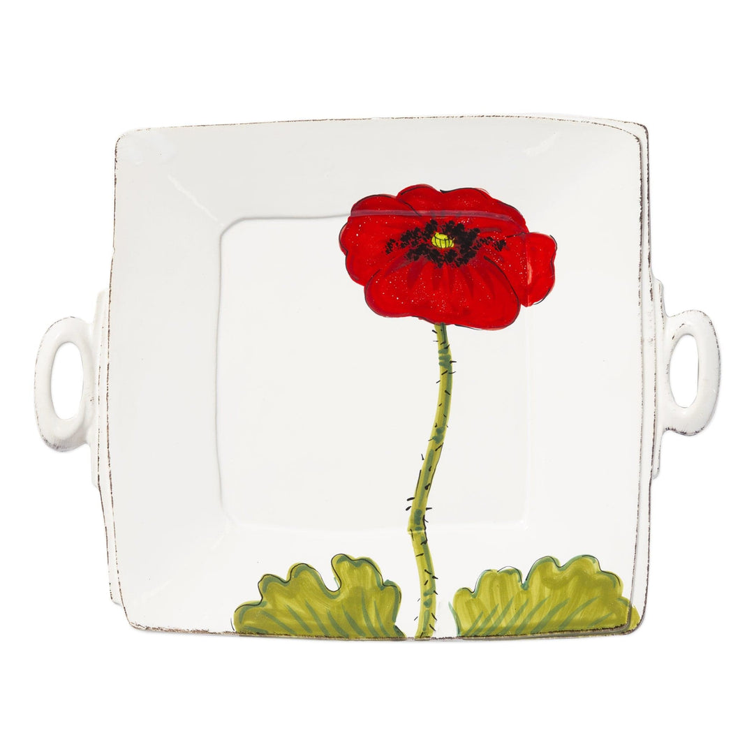 Handpainted in Tuscany, the Lastra Poppy Handled Square Platter is a colorful addition to your serving accessories. An overlapping wooden mold, used for centuries to form cheeses throughout Italy, inspired this collection.
