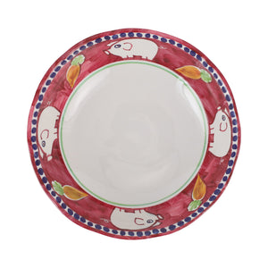 The Melamine Campagna Porco Large Serving Bowl features cheerful, curly-tailed pigs, and its durable material makes a perfect serving piece for outdoor gatherings.