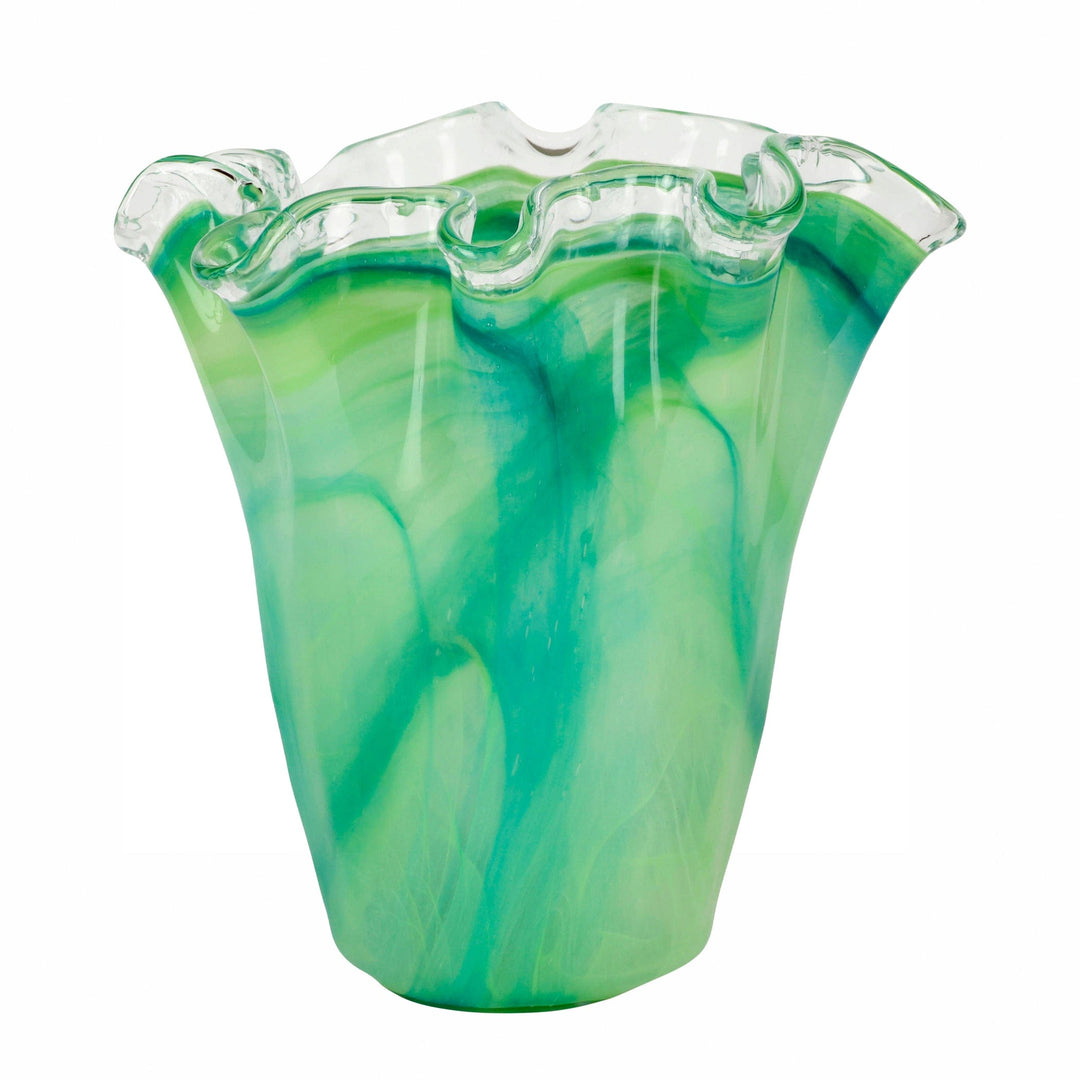 Mouthblown in Italy, the Onda Glass Green Ruffled Vase makes a sophisticated centerpiece on its own or filled with fresh flowers.