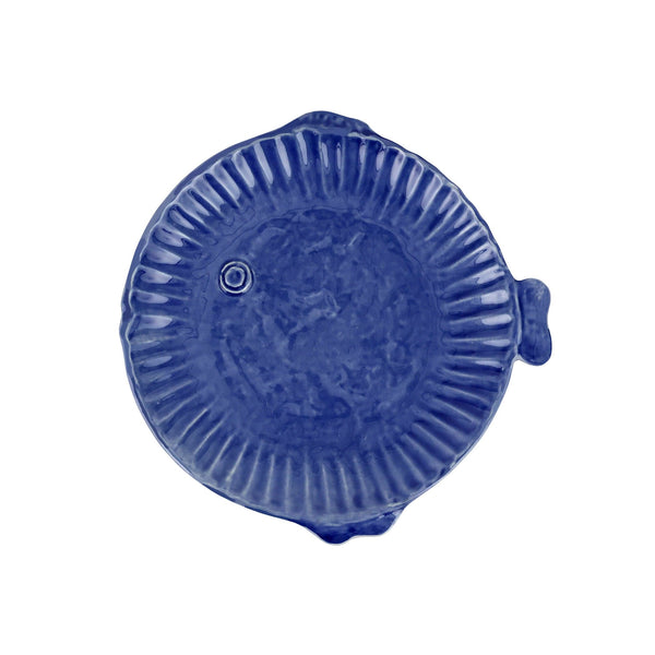 Playing off the handpressed edges of Pietra Serena, Pesce Serena features unique fish silhouettes in a glossy white glaze that reflects light like sunshine glimmering on the ocean waves. This Pesce Serena Cobalt Salad Plate is a perfect table base for any ocean or beach lover.