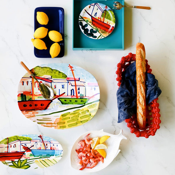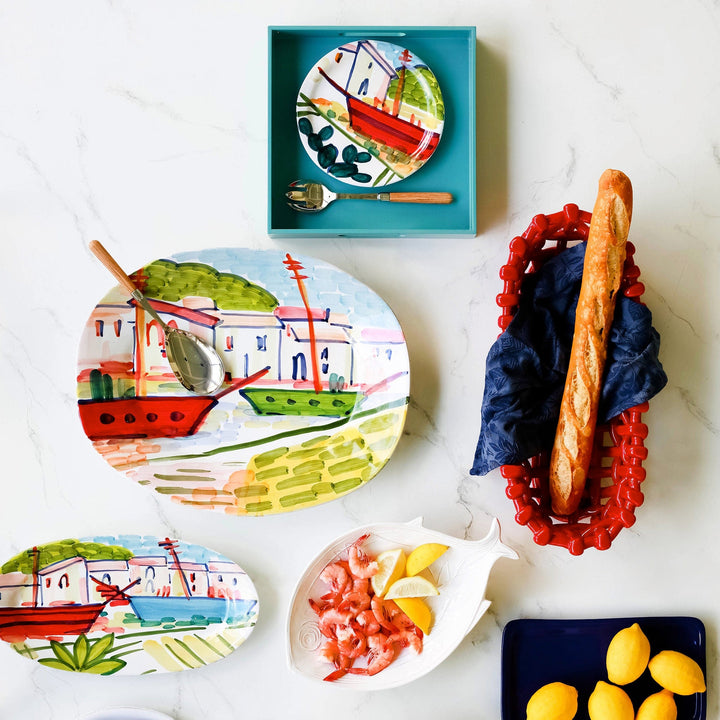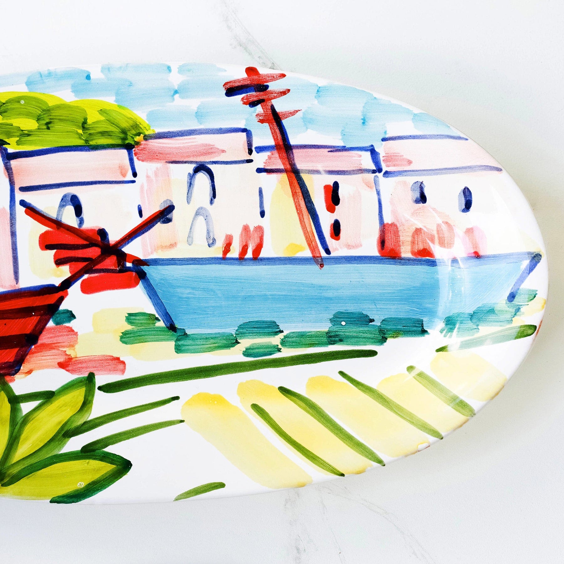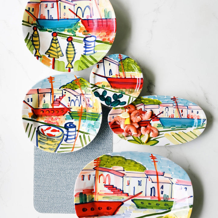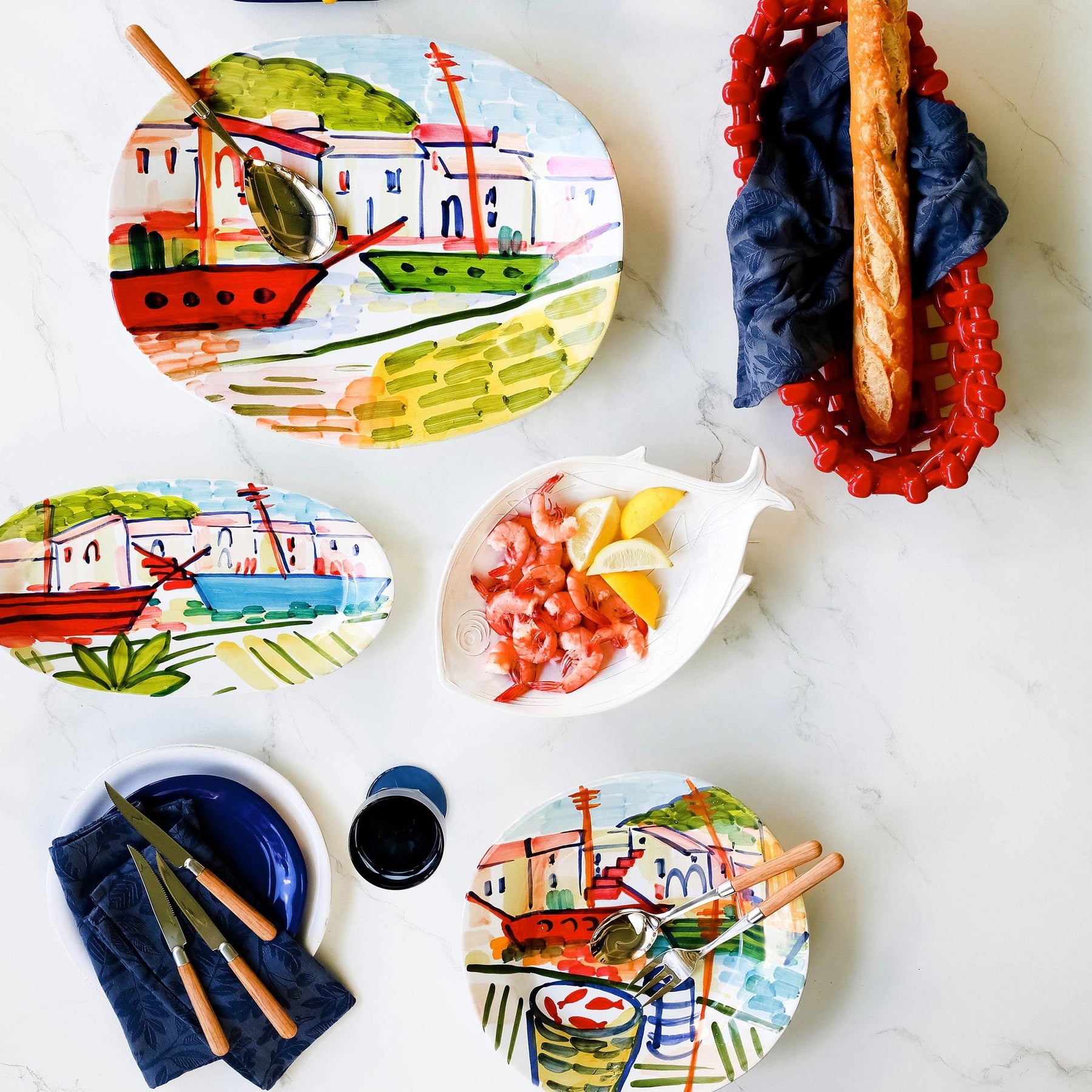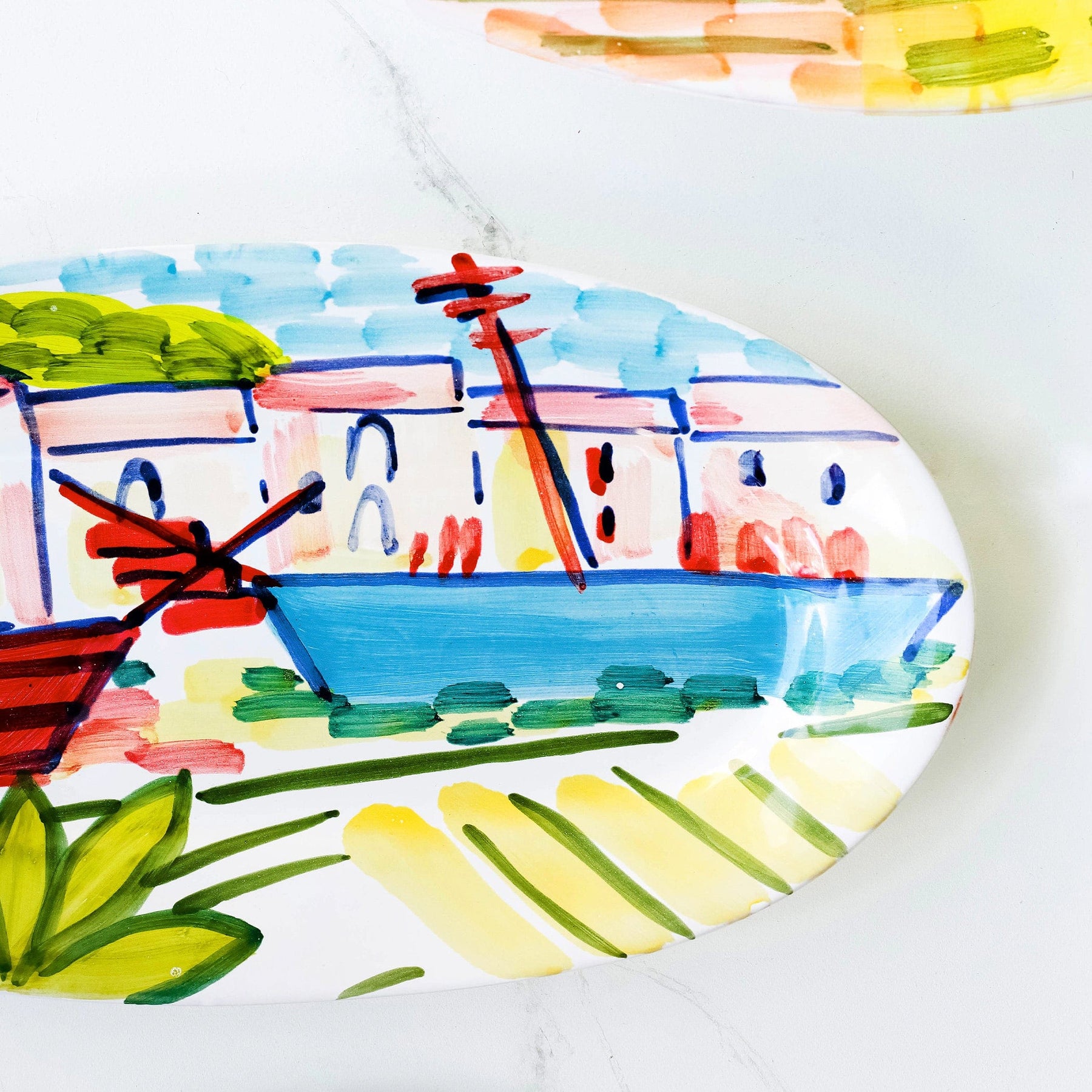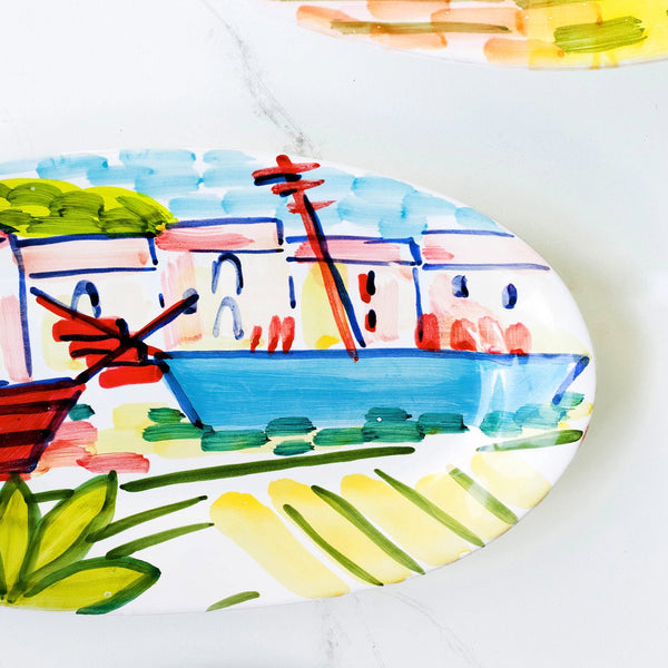 The small fishing village comes to life in vibrant colors and abstract brushstrokes on the Portofino Small Oval Platter, inspired by the charming habor along the Italian Riviera.