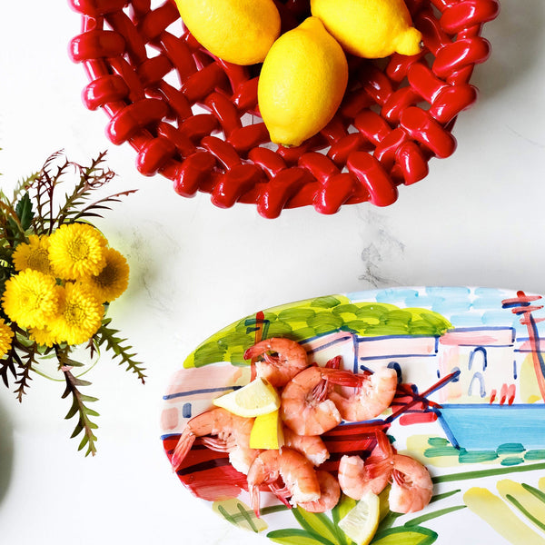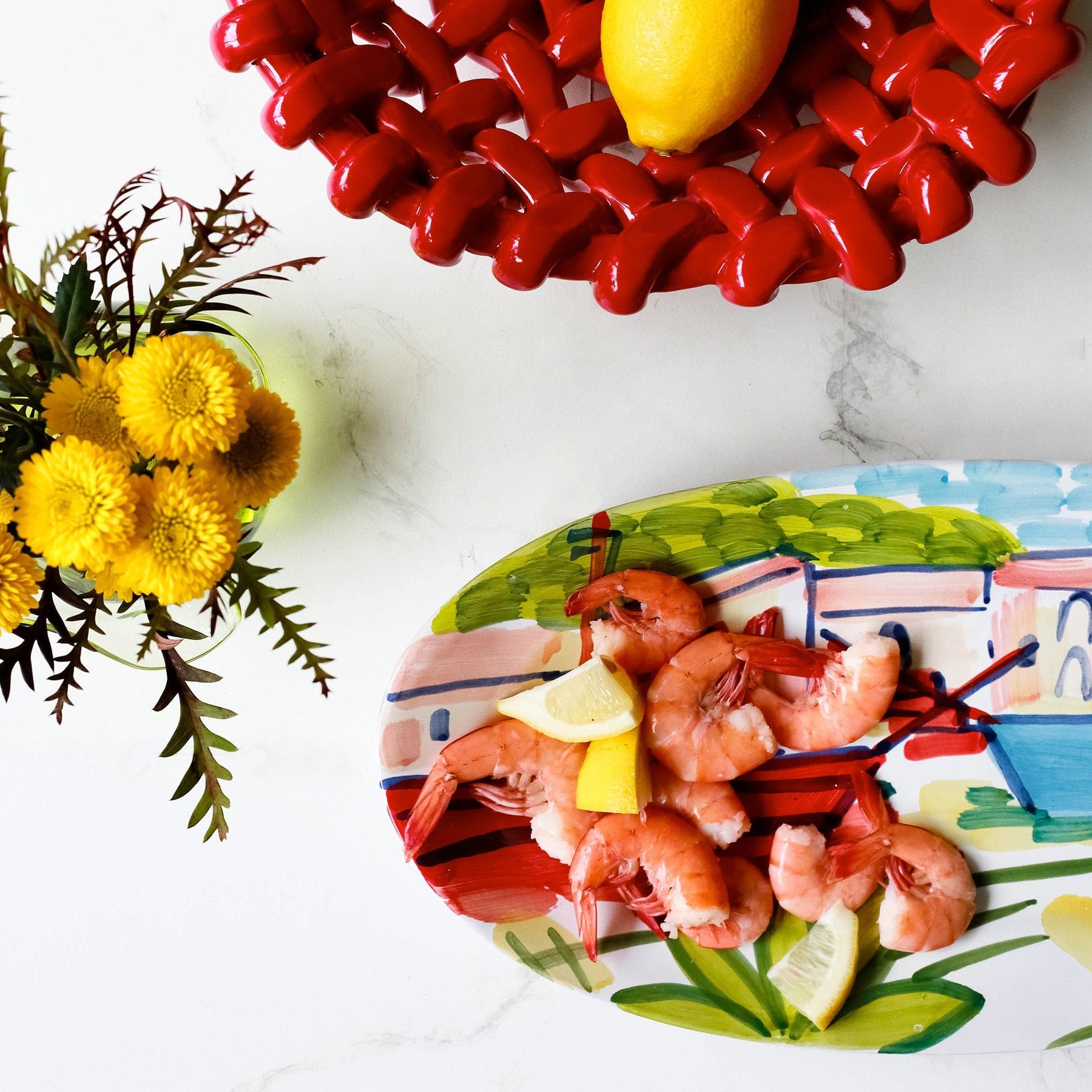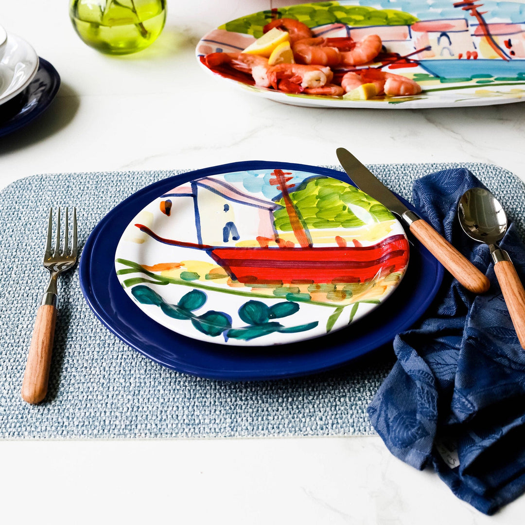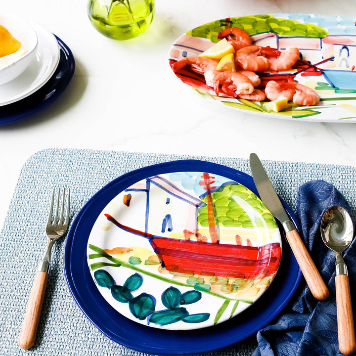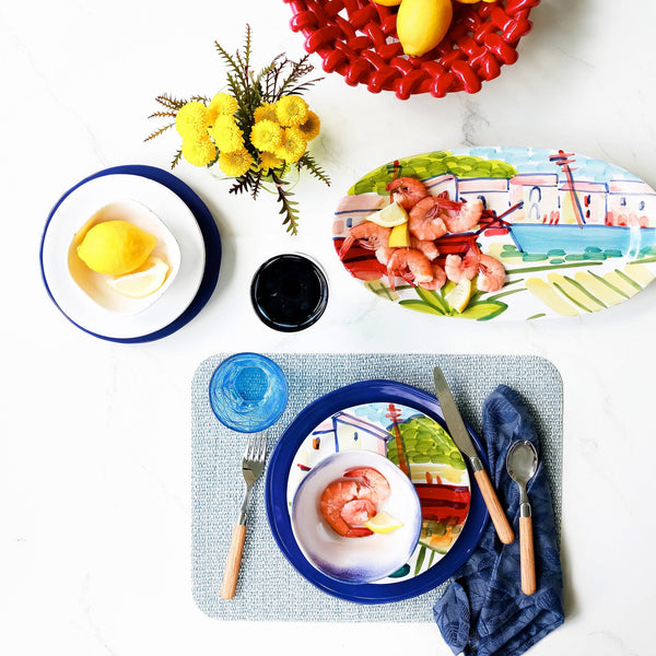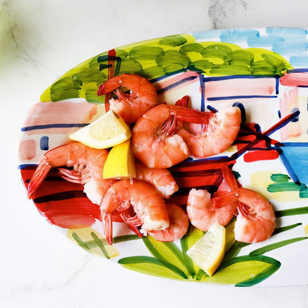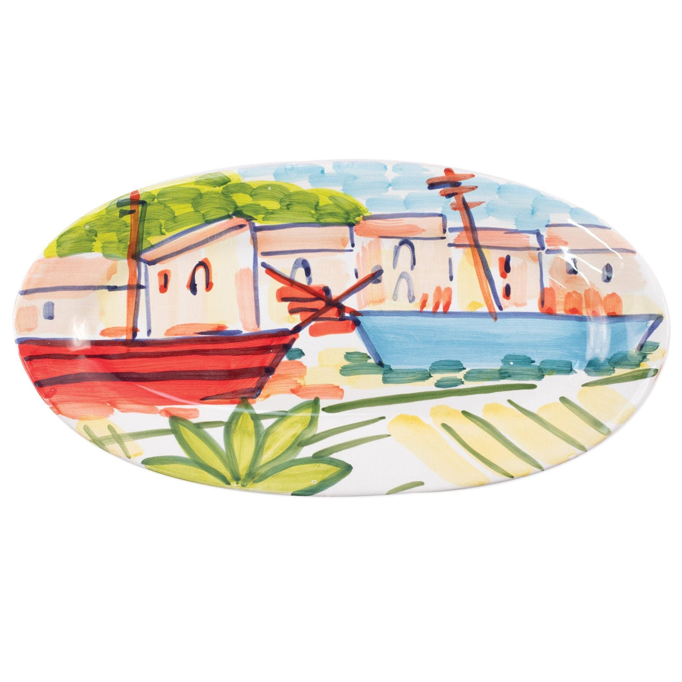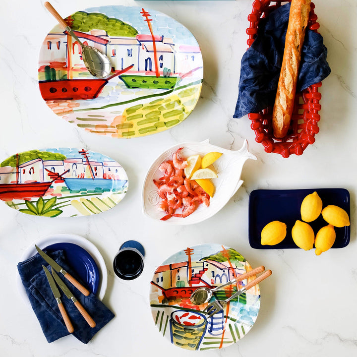 The small fishing village comes to life in vibrant colors and abstract brushstrokes on the Portofino Small Oval Platter, inspired by the charming habor along the Italian Riviera.