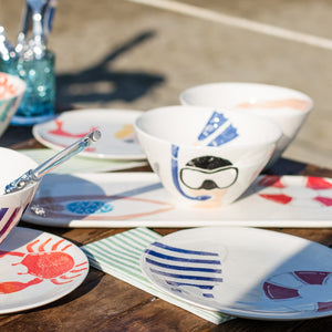 Pure fun, the Riviera Scuba Cereal Bowl celebrates la dolce vita. The collection's assortment of swimsuits, snorkels, flipflops, and sea life capture the joy and warmth of an Italian beach, and they make all of your gatherings feel like a long-awaited and well-deserved vacation.