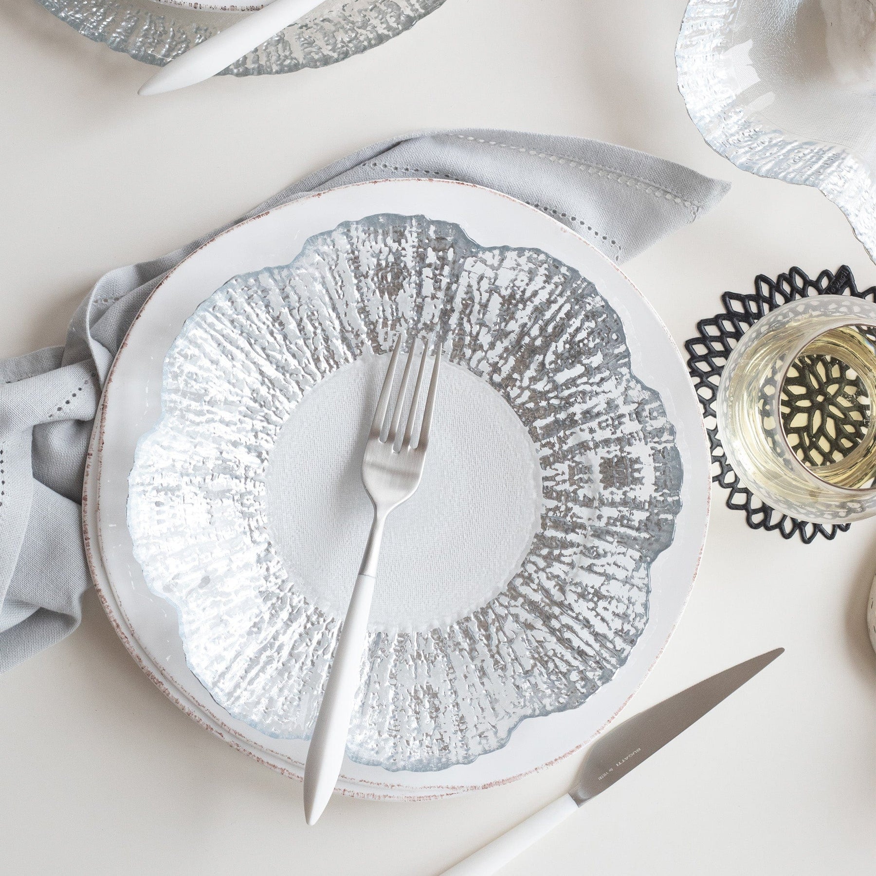 With glowing strands and beautiful texture, the Rufolo Glass Canape Plate brings luster, glamour, and irresistibly Italian style to your table.