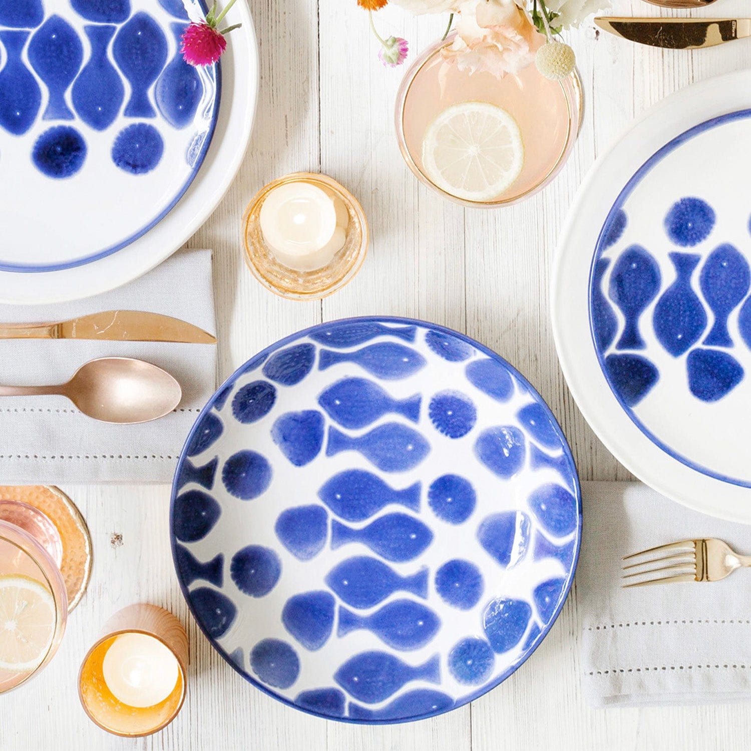 Make everyday entertaining a splash with the playful design of the Santorini Fish Dinner Plate, a perfect mix of blue and white that easily layers with the mosaic patterns of Santorini.