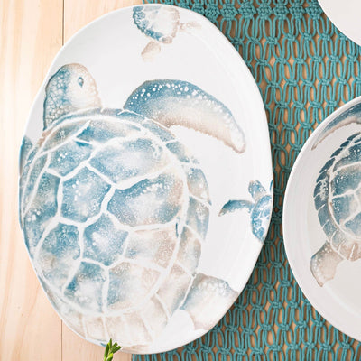 The handpainted sea turtle is rendered in hues of aqua and taupe against a clean, white canvas on the Tartaruga Medium Oval Platter. Maestro artisan, Gianluca Fabbro, utilizes a unique sponging technique to carefully add detail to each piece.