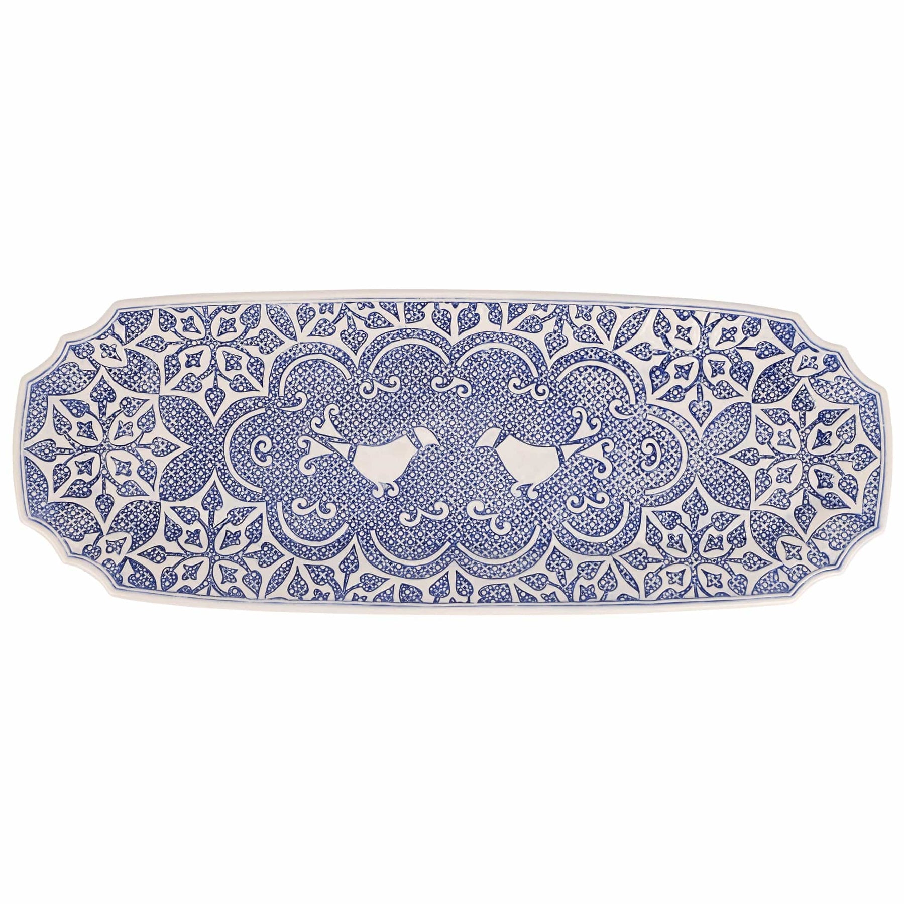 Inspired by the handpainted tiles and textiles of Italy, the Uccello Blu Long Oval Platter pays homage to the country’s long tradition of intricate, geometric designs. Italian artisans bring a fresh element to this collection with crisp, graceful edges and the plucky, good luck bird hidden in the design.